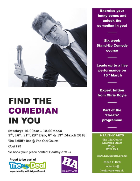 A 6 week stand-up comedy course leading to a live performance in the Bailiff’s Bar at The Old Courts, Wigan. Participants were subsequently invited to watch their tutor perform at the ‘A Clucking Good Night Out’ fundraising event for Luck Hens Rescue in Hindley.